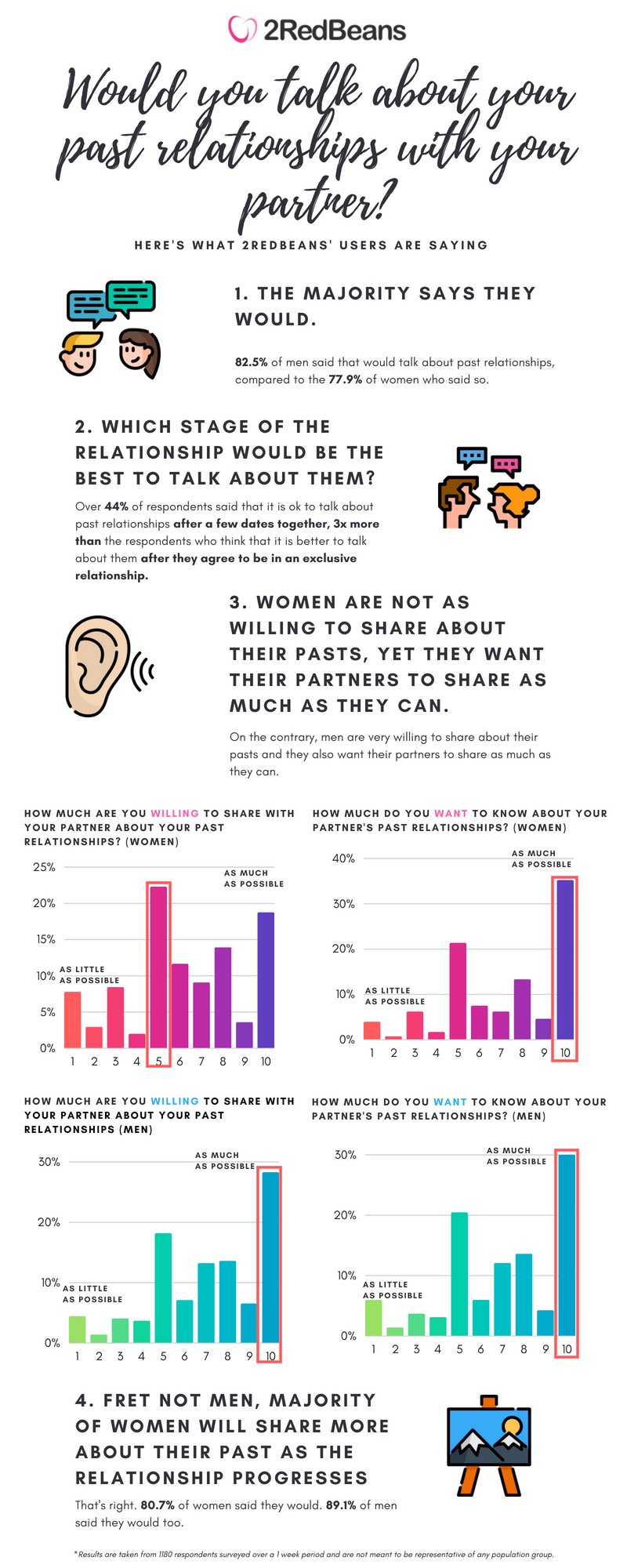 To find out opinions on the topic of past relationships, 2RedBeans asked our users if they would talk about their past relationships with their partner, which stage of the relationship should they be in before talking about them, their willingness to share and their willingness to listen to their partner’s past relationships and, lastly, the reason that is holding them back from sharing.